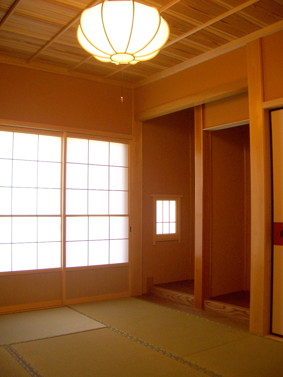 屋外に広がる開放的な居間とは対照的に障子で仕切られた小さな床の間は、